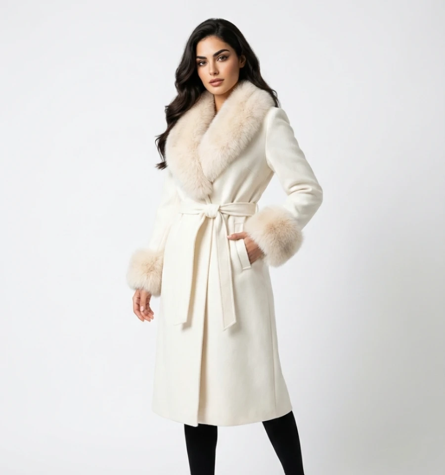 Réalisé en tissu cachemire doux et léger, ce manteau assure une excellente sensation de chaleur sans être lourd, ce qui le rend parfaitement adapté aux journées fraîches. Les manches décorées d’une finition en fausse fourrure douce ajoutent une touche de sophistication et rehaussent l’élégance de la tenue.